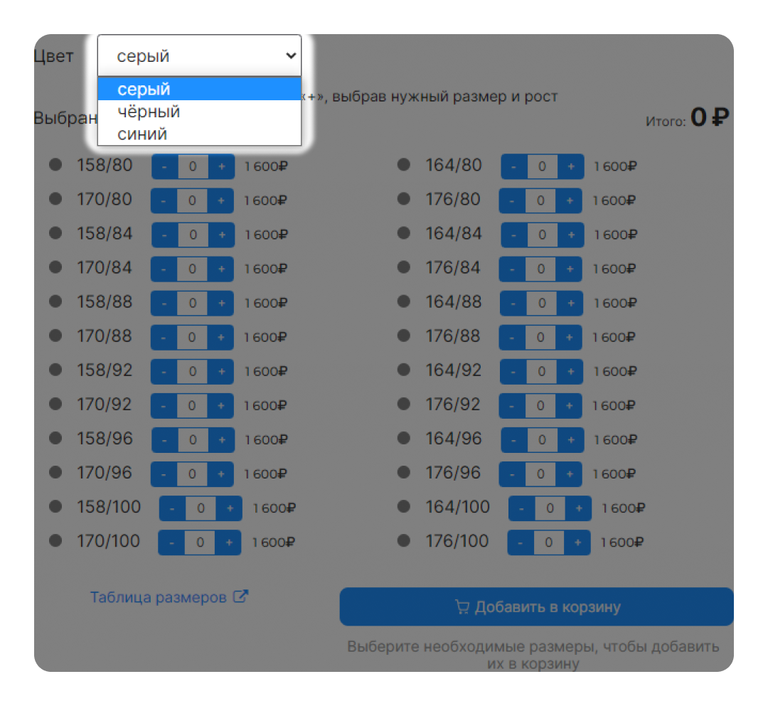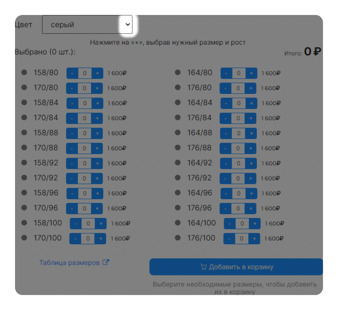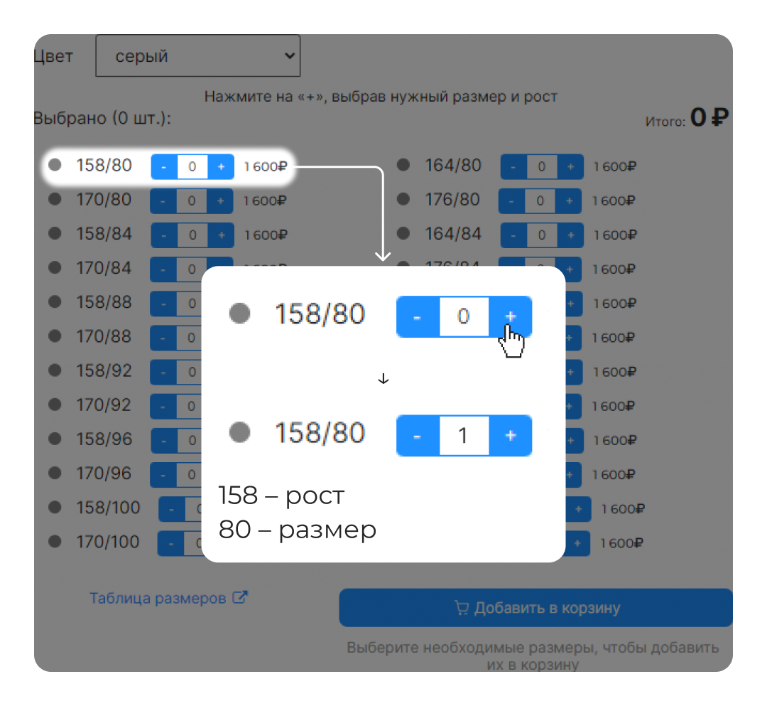 - В большом списке выбрать количество нужных изделий, с соответствующим ростом и размером, путём нажатия на “+”. После нажатия “+” цифра “0” в поле поменяется на количество добавляемых изделий в корзину