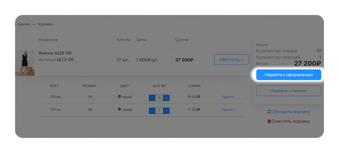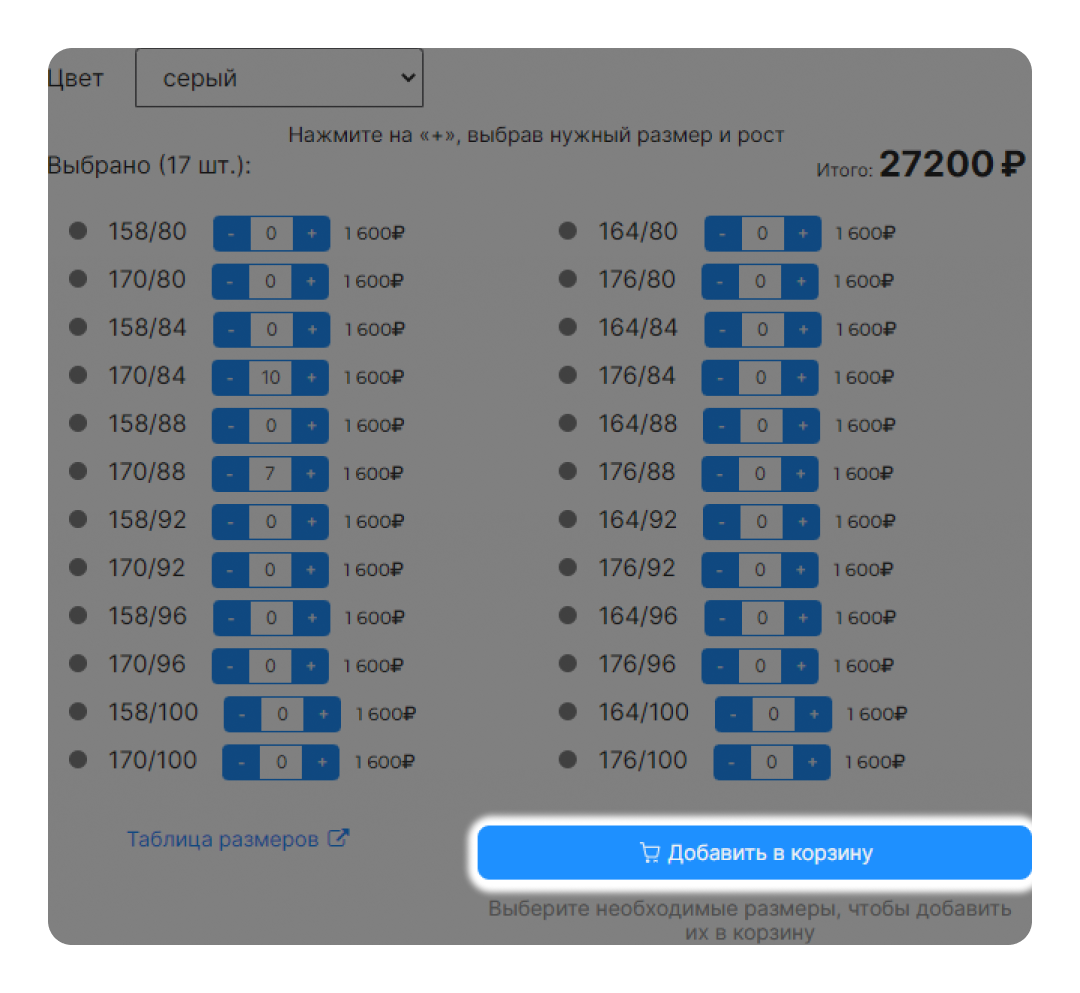 Таким образом, в примере, который показан на картинках, в корзину было добавлено 17 изделий размеров и роста, на общую сумму 27 200₽: