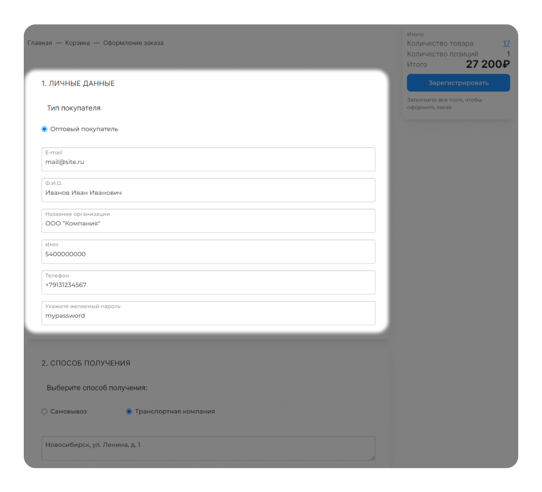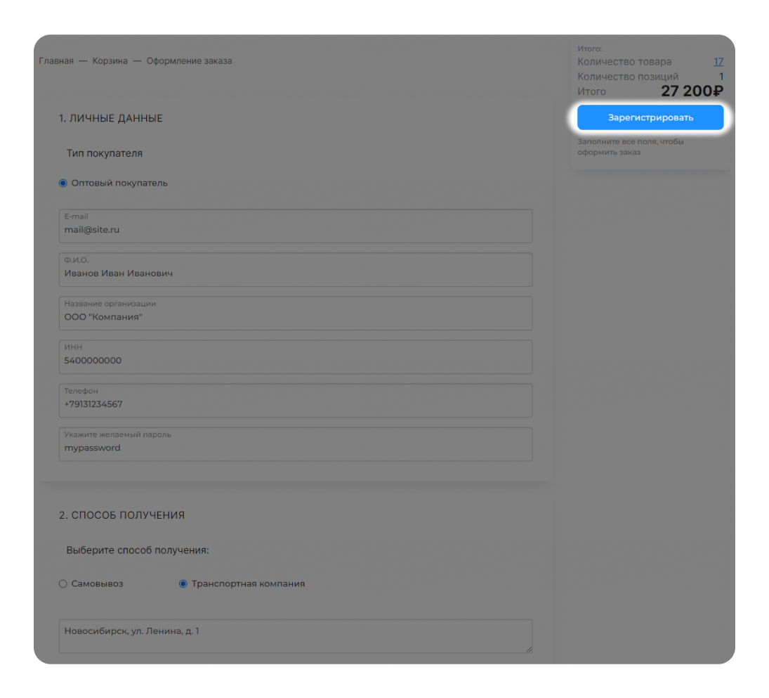 - На следующем этапе вам нужно будет пройти регистрацию на сайте (если вы уже не зарегистрированы и не вошли в свою учётную запись через кнопку “Вход”), которая включена в процесс оформления заказа. Вам нужно будет заполнить все поля с информацией о вас и вашей компании, а также указать желаемый пароль для вашей учётной записи