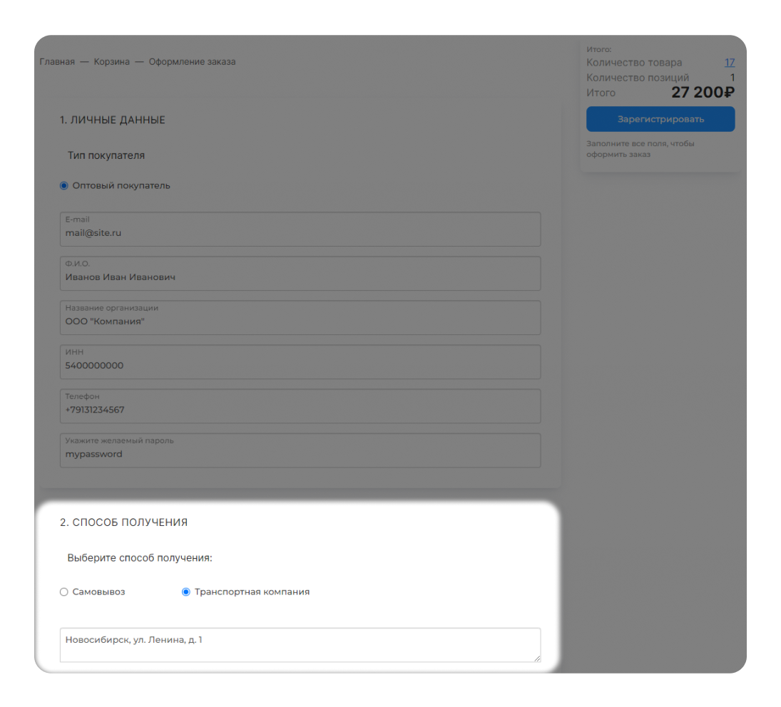 - Далее нужно будет выбрать способ получения заказа и при выборе способа получения «Транспортная компания» указать адрес, куда вы хотите получить заказ